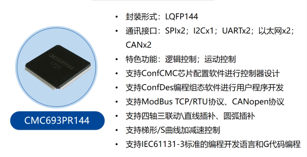 CMC(Control Module on Chip)芯片是由中控微电子有限公司开发的全国产工控芯片,专用于可编程控制器的核心处理芯片。CMC芯片通过硬件电路实现逻辑控制、运动控制、输入输出、通信接口和数据存储等多种功能。CMC芯片作为控制器主芯片独立运行外,还可以多个芯片通过总线连接,以主/从控制器方式实现扩展。用户根据我们提供的典型设计,可快速完成基于CMC芯片的控制器软硬件开发。芯片集成了Flash、SRAM、通用定时器、PLL等功能,以及以太网MAC、UART、CAN、SPI、I2C等多种通信接口。